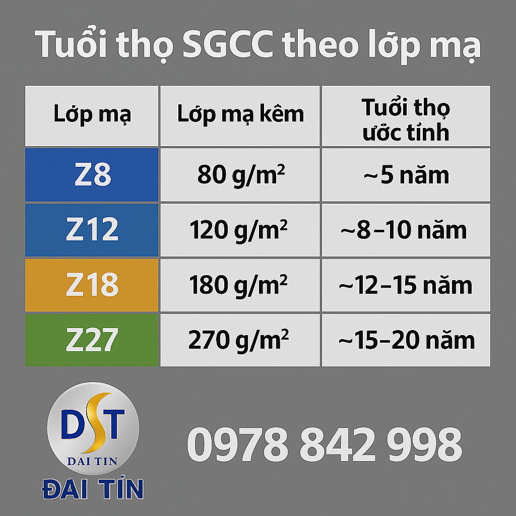 Z18 (180g/m²): dùng trong nhà máy, môi trường ẩm nhẹ, tuổi thọ 12–15 năm