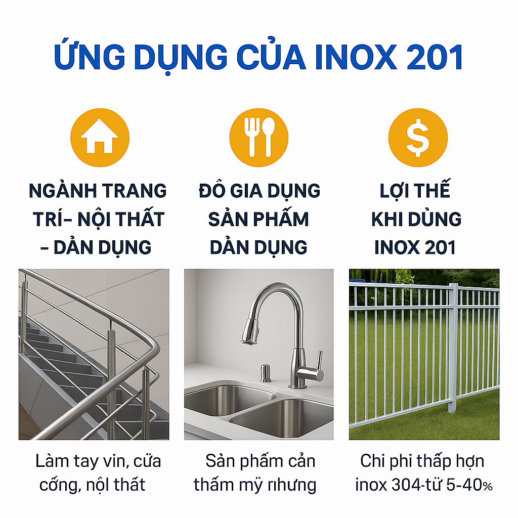 Inox 201 là phiên bản tiết kiệm hơn, chứa ít Niken, thay bằng Mangan, giá thành thấp hơn, dùng phổ biến cho các sản phẩm dân dụng, trang trí nội thất.