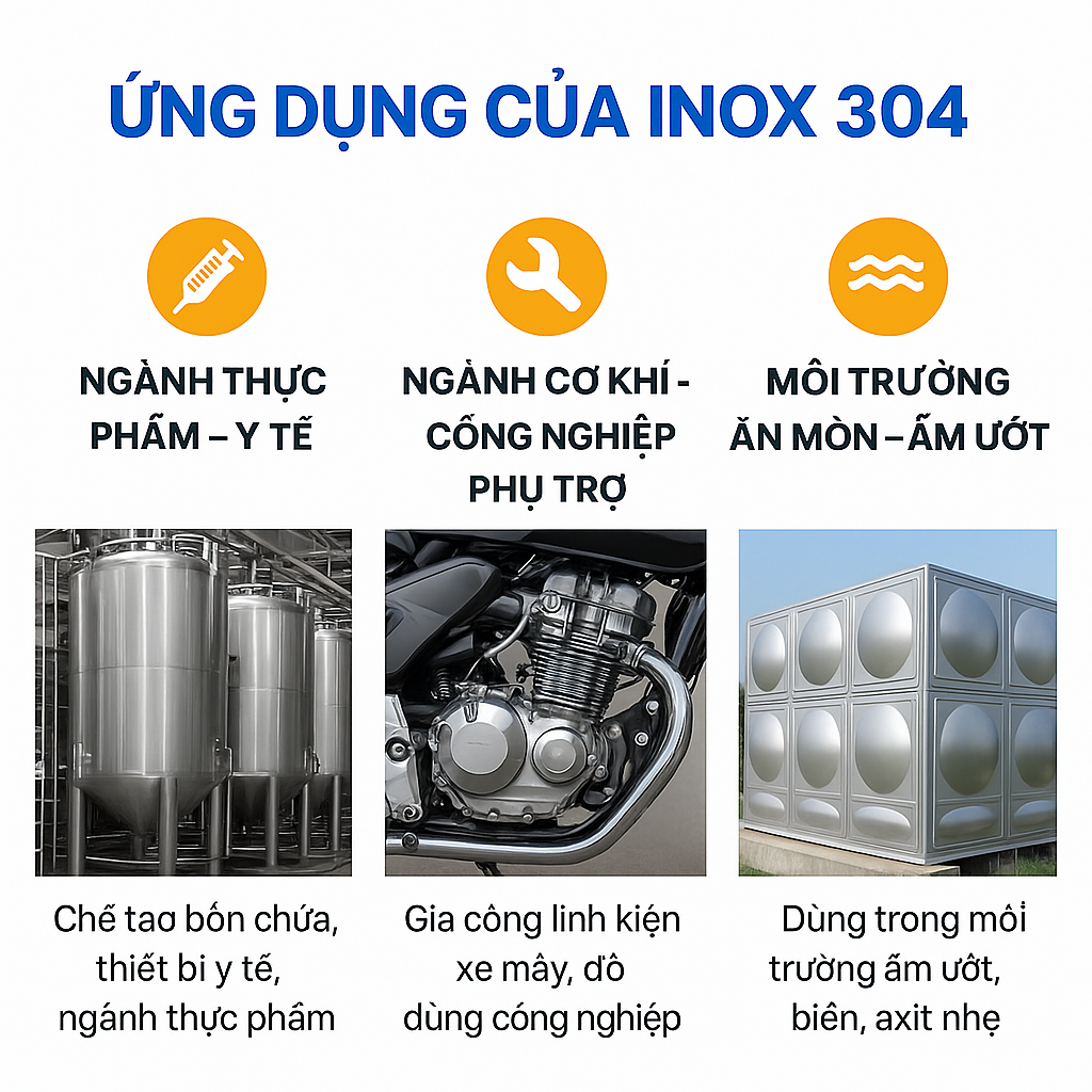 Inox 304 là loại thép không gỉ chứa 18% Cr và 8% Ni, chống ăn mòn vượt trội, độ bền cao, ứng dụng rộng rãi trong ngành cơ khí, thực phẩm, y tế.