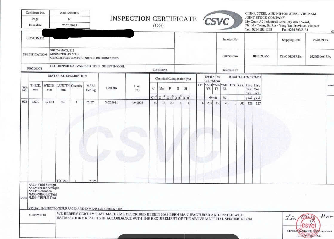 Thép mạ kẽm SGCC là loại thép được phủ lớp kẽm chống gỉ bề mặt, giúp nâng cao độ bền, khả năng chống ăn mòn và kéo dài tuổi thọ sử dụng. Sản phẩm nguồn CSVC (China Steel Sumikin Vietnam) được sản xuất theo tiêu chuẩn JIS G3302 (Nhật Bản), đảm bảo chất lượng vượt trội, phù hợp với các doanh nghiệp cơ khí đòi hỏi tính ổn định cao.