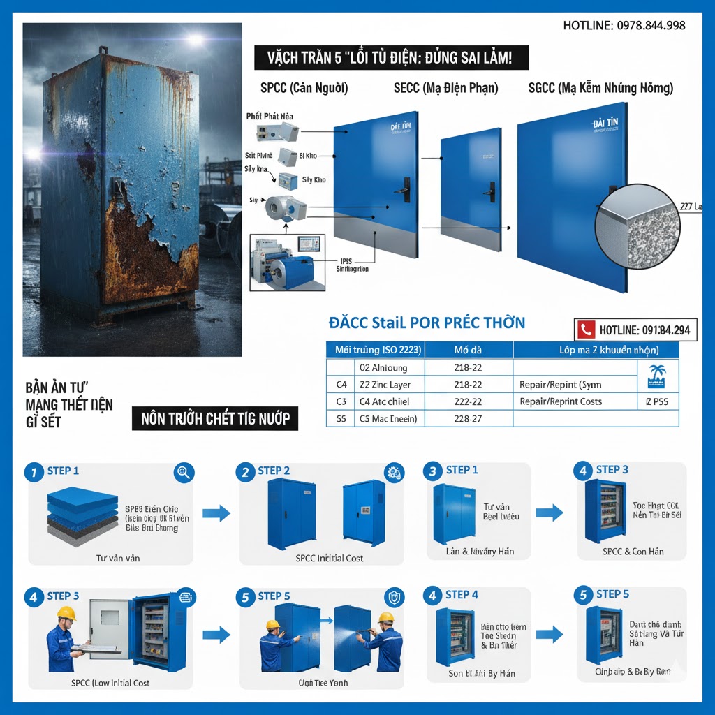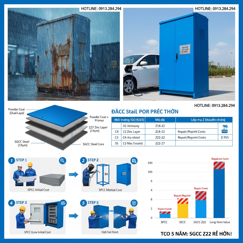 Quy tắc vàng: Đối với vỏ tủ điện ngoài trời tại Việt Nam (môi trường nhiệt đới, độ ẩm cao, tương đương C3-C4), không bao giờ sử dụng thép SGCC có lớp mạ dưới Z18.