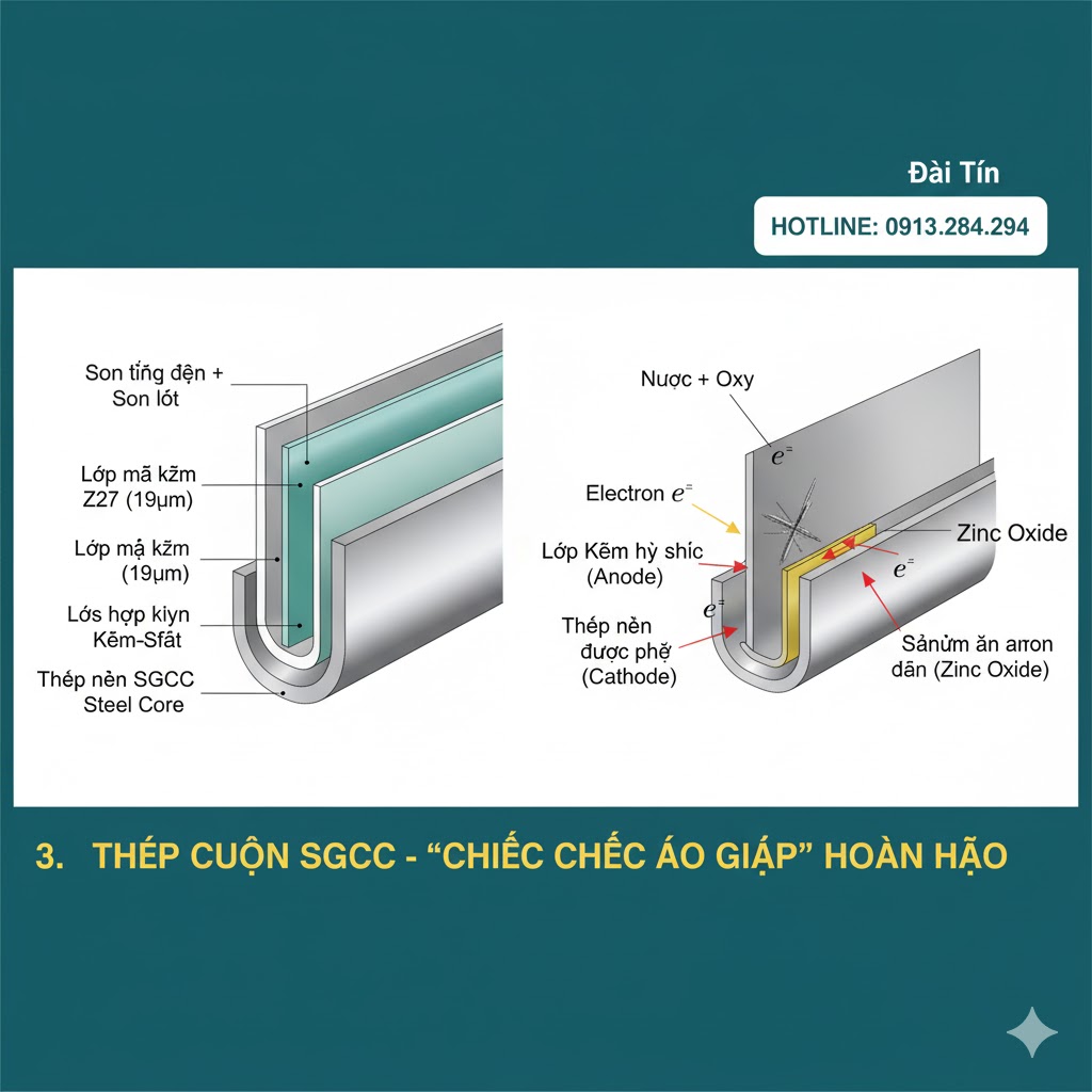 Như đã đề cập, SGCC là thép nền cán nguội được nhúng vào một bể kẽm nóng chảy. Trong quá trình này, một điều kỳ diệu đã xảy ra: Kẽm không chỉ bám vào bề mặt thép, nó còn phản ứng với sắt để tạo ra một loạt các lớp hợp kim Kẽm-Sắt ngay trên bề mặt. Lớp trong cùng có hàm lượng sắt cao nhất và cứng nhất, các lớp tiếp theo có hàm lượng sắt giảm dần và mềm hơn, ngoài cùng là lớp kẽm nguyên chất.